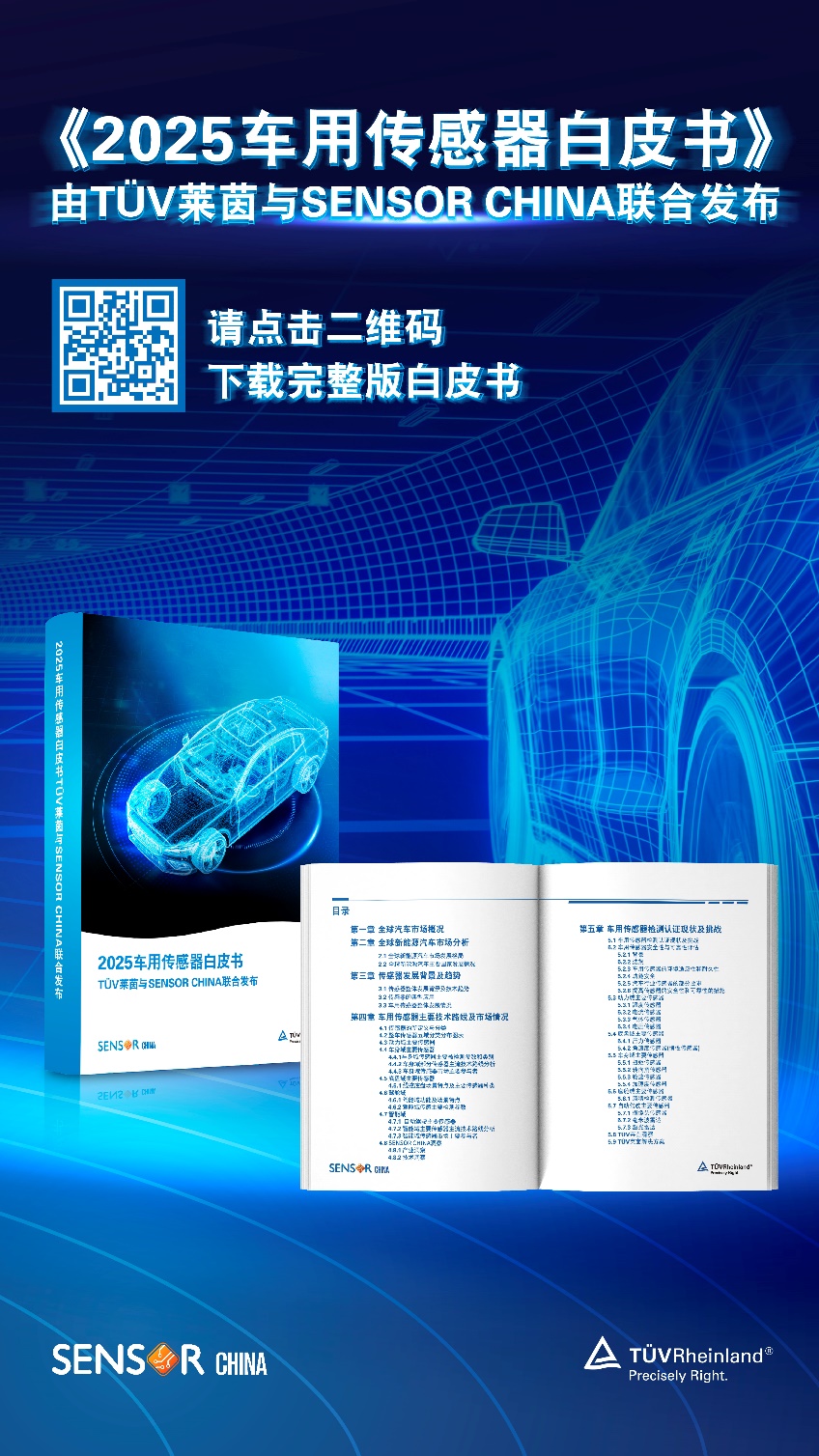 面对汽车智能化、电动化浪潮下的快速市场变迁与严苛安全需求,TÜV莱茵与SENSOR CHINA联合发布《2025车用传感器白皮书》。基于“五大汽车域”(动力、底盘、车身、驾舱、自动驾驶)构建系统性分析框架,深入梳理传感器技术演进、市场竞争格局及全球核心合规路径(涉及法规、标准、测试等)。为车企及其供应商提供了应对动态市场、同步满足创新加速与安全合规双重挑战的权威参考与解决方案。