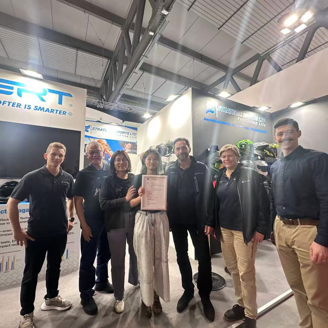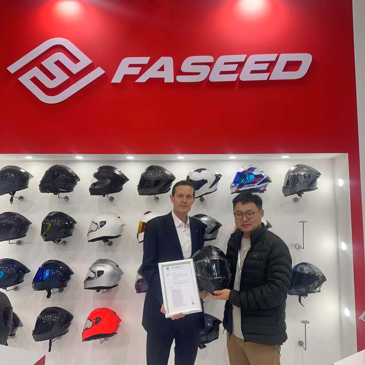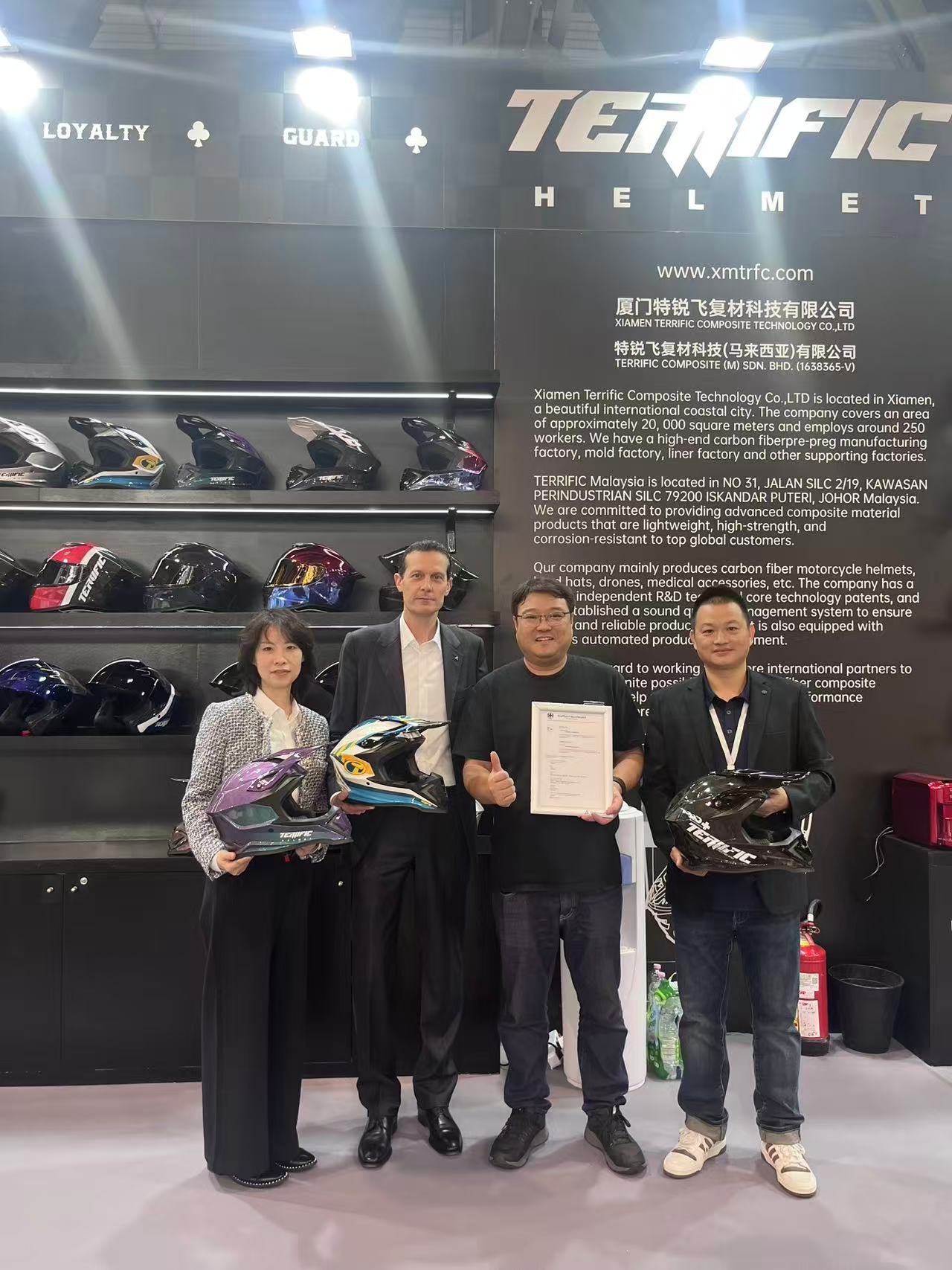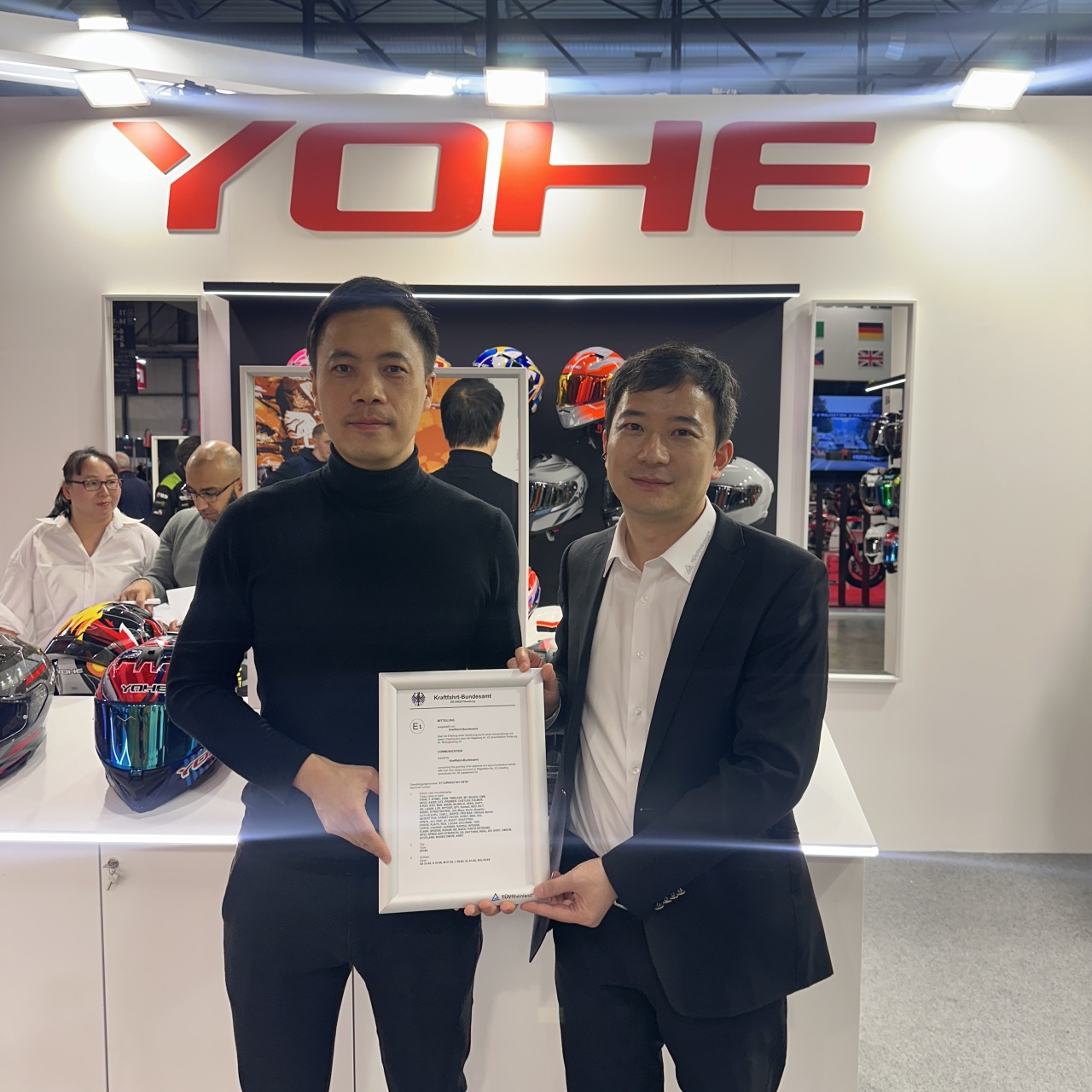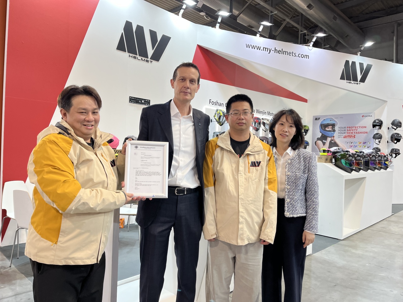 在EICMA展上,TÜV莱茵为厦门特锐飞复材科技有限公司头盔(型号TR-MF07)、佛山南海永恒头盔制造有限公司头盔(型号937SV)、兰溪市野马摩托配件有限公司头盔(型号YM-916-1)、鹤山市创搏体育用品有限公司头盔(型号P121)、广州市晋颢体育用品有限公司头盔(型号XP-28)、东莞韬略运动器材有限公司头盔(型号ST-11168)、佛山市顺德区文锦机车配件有限公司头盔(型号OF855)、江阴市达菲玛汽配科技有限公司头盔(型号FS-X65)颁发UN R22.06 E-mark认证证书,为深圳市思创新材科技有限公司护具(型号TWⅡ-CB1-S、TWⅡ-FB1-M、TWⅡ-FB1-L、TWⅡ-FB1-XL)颁发CE符合性认证证书。这表明相关产品已具备进入欧盟市场的资格,同时也有助于提升消费者对产品的信任度和满意度。