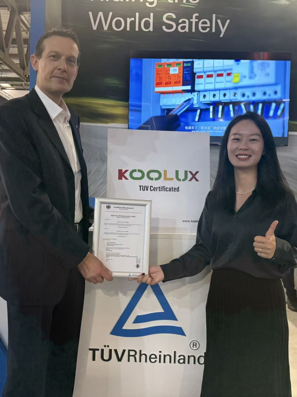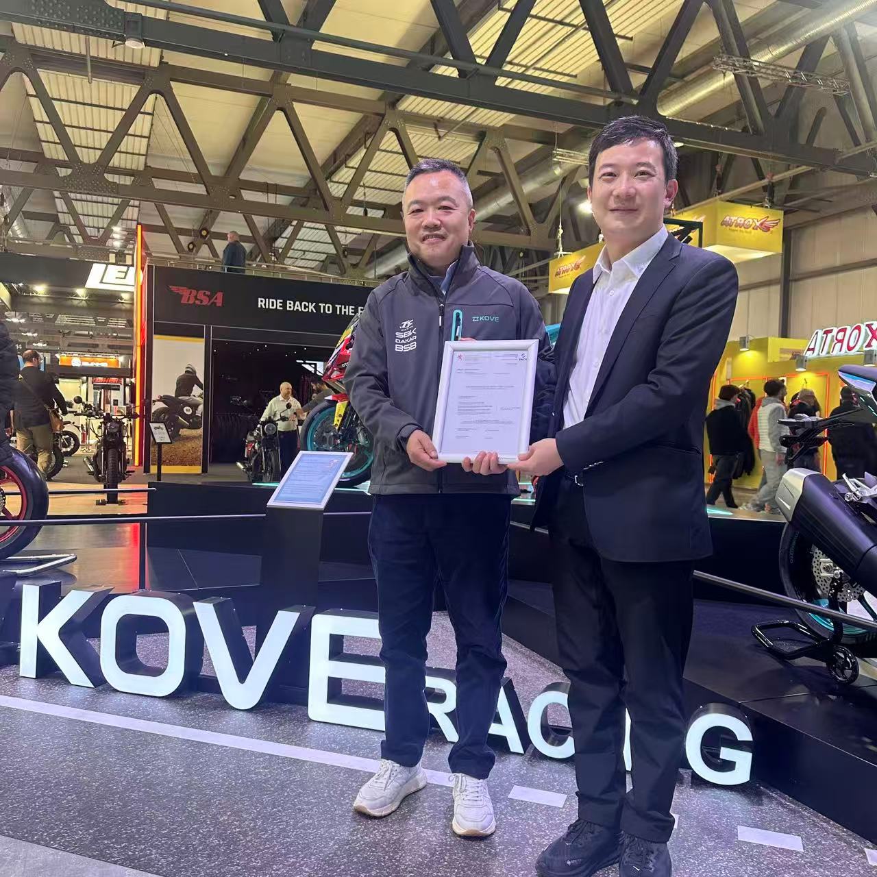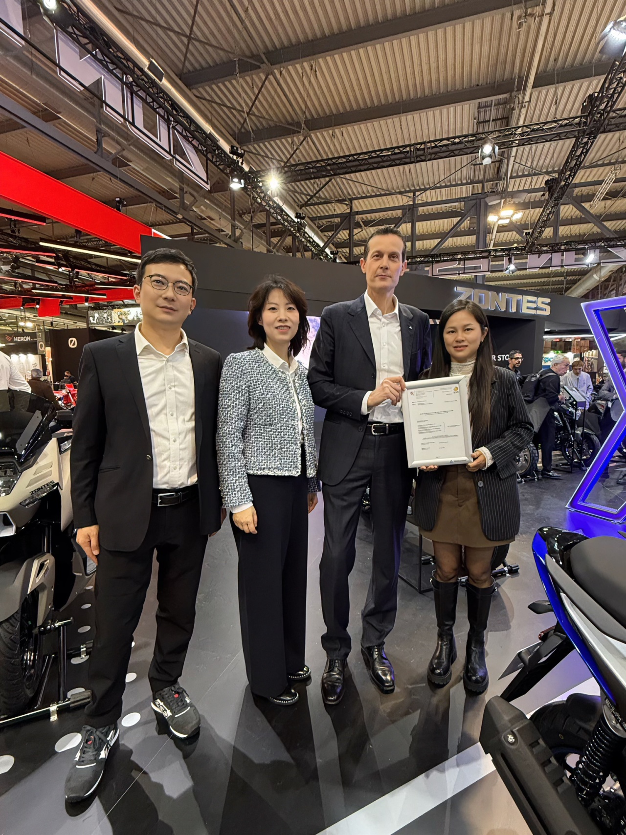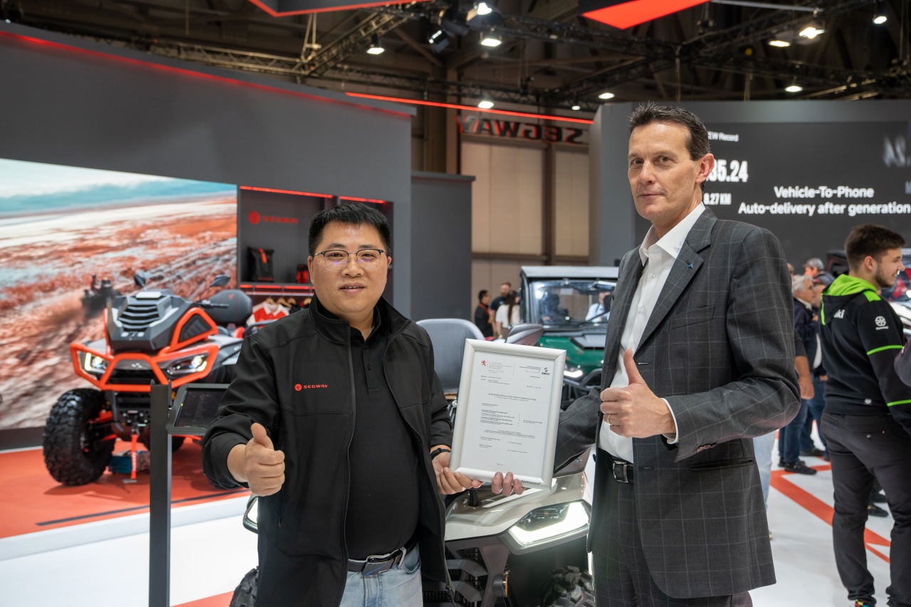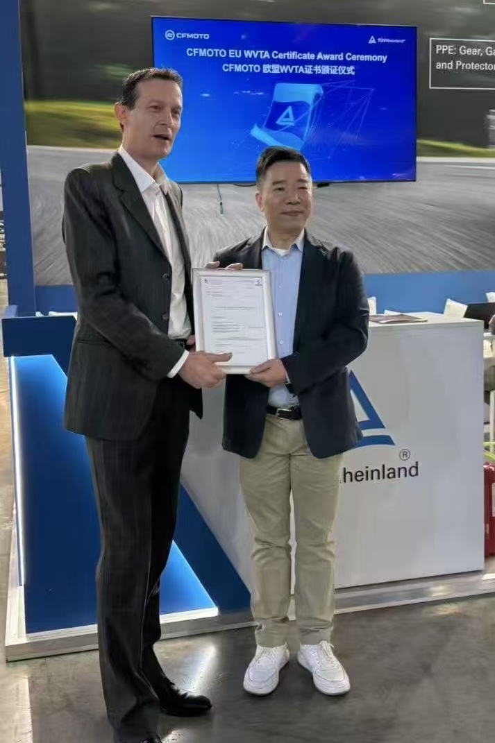 展会期间,TÜV莱茵为浙江钱江摩托股份有限公司摩托车(型号PE0)、浙江春风动力股份有限公司摩托车和全地形车(型号CF700-9AH和CF1000AU-4L)、西藏新珠峰摩托车有限公司摩托车(型号KY800X-B)、赛格威科技有限公司摩托车(型号SGW500F-A7)、广东大冶摩托车技术有限公司摩托车(型号ZT700-I)颁发了卢森堡交通部签发的WVTA证书,为79BIKE两轮电动摩托车(型号DH2000DY)颁发匈牙利交通部签发的WVTA证书,为云通达(深圳)人工智能有限公司电动滑板车(型号H11)颁发德国交通部签发的ABE证书。获颁证书表明这些产品的安全性与合规性已达到欧盟准入要求,为其进入欧盟市场打下坚实基础。