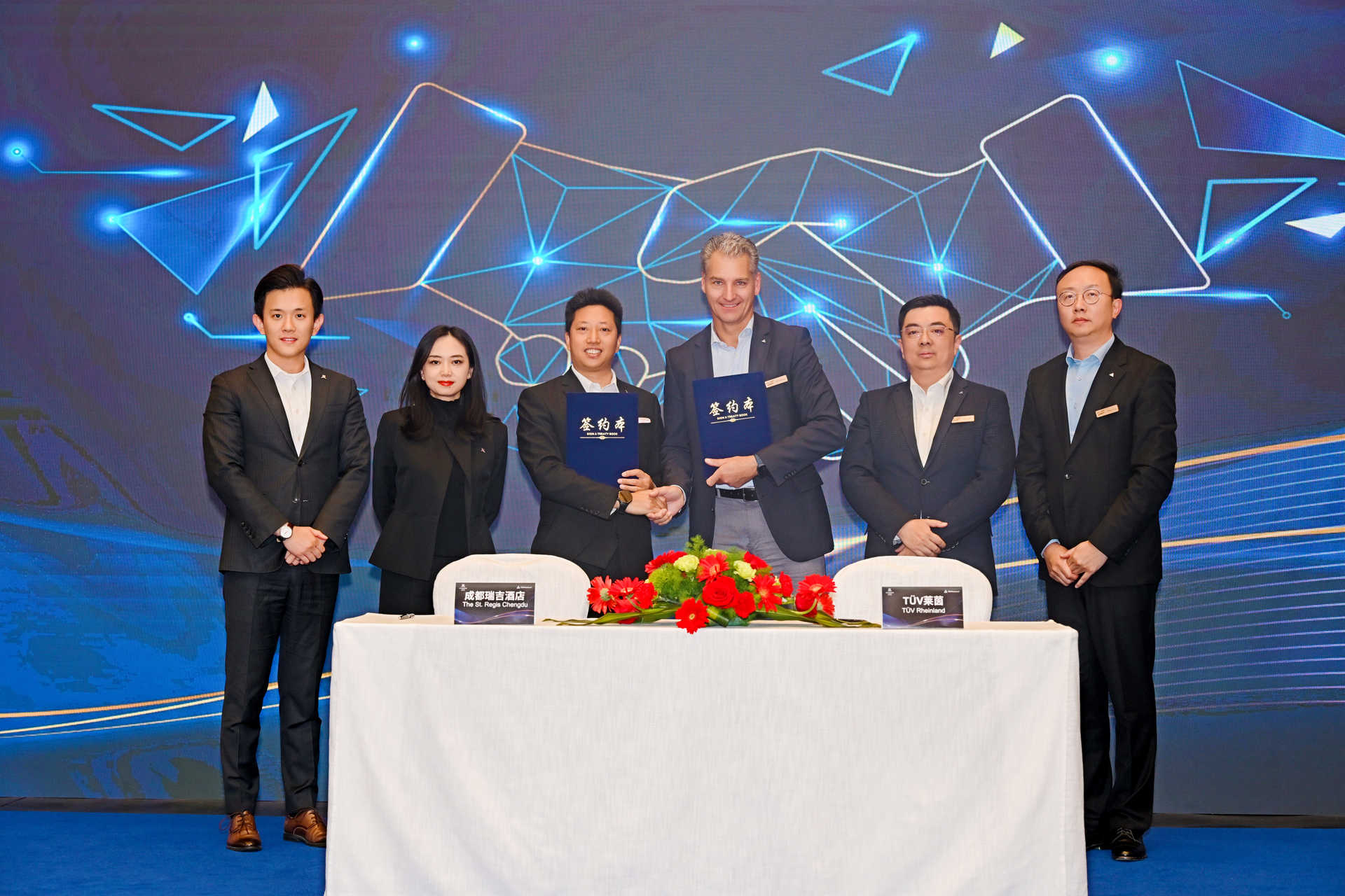 成都瑞吉酒店总经理黄建兵(左三)、成都瑞吉酒店市场销售总监熊雨竹(左二)、成都瑞吉酒店销售总监陈旭丹(左一),TÜV 莱茵客制化服务全球高级副总裁Kai Hoehmann(右三)、大中华区人员与业务保障服务事业群高级副总裁陈永海(右二)、客制化服务副总裁方华(右一)等双方代表出席签约仪式。